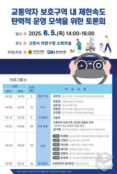 e데일리뉴스 | 경기연구원은 5일 고양시 덕양구청 소회의실에서 ‘교통약자 보호구역 내 제한속도 탄력적 운영 모색’을 주제로 토론회를 개최한다.