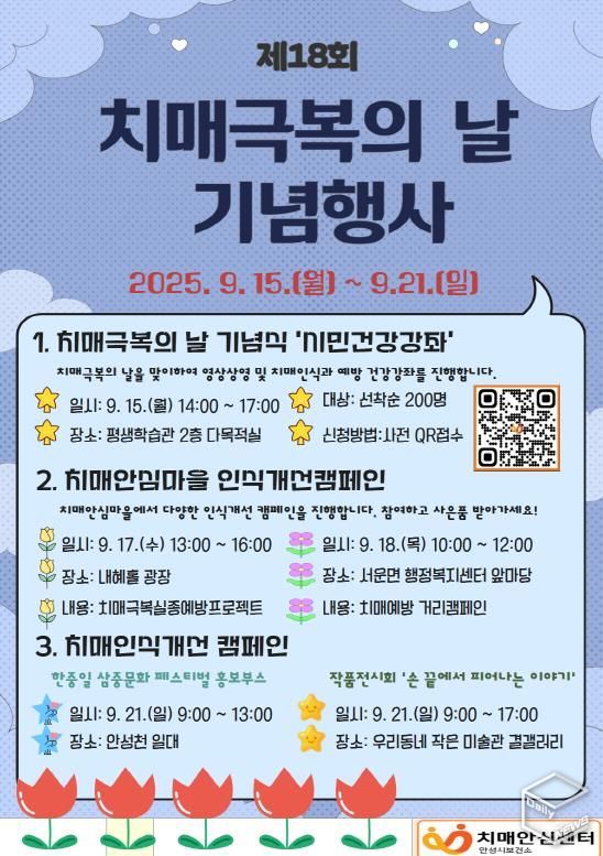 e데일리뉴스 | 안성시치매안심센터는 제18회 치매극복의 날(9월 21일)을 기념해 오는 9월 15일 개최되는 ‘2025 치매극복의 날 기념식’ 참여자를 모집한다.