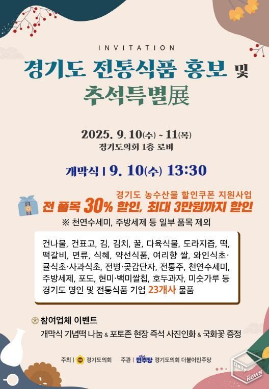 더불어민주당은 오는 10일∼11일 양일간 경기도의회 로비 1층에서 ‘경기도 전통식품 홍보 및 추석특별전’을 개최한다.