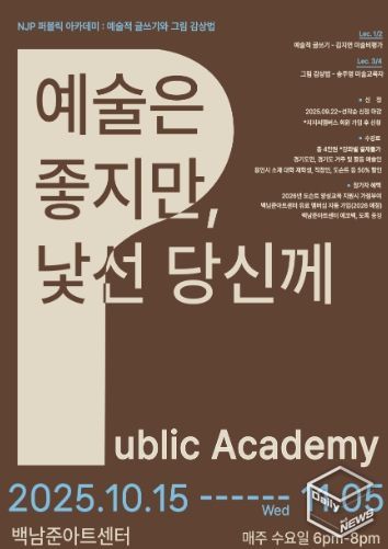 e데일리뉴스 | 경기문화재단 백남준아트센터가 오는 10월 15일부터 11월 5일까지 매주 수요일 저녁, 성인 대상 프로그램 ‘NJP+ 퍼블릭 아카데미: 예술적 글쓰기와 그림 감상법’을 운영한다. 이번 아카데미는 예술은 좋지만 다소 낯설게 느껴졌던 성인들에게, 작품과 친밀하게 소통하고 자기만의 언어로 표현하는 방법을 제시하는 실습과 강의가 접목된 과정이다.