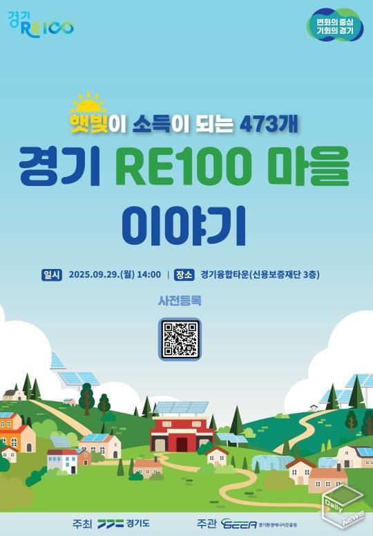 e데일리뉴스 | 경기도는 9월 29일 오후 2시 경기융합타운(신용보증재단 3층)에서 ‘경기 RE100 마을 이야기’ 행사를 개최한다. 이번 행사는 도민들이 주도해 조성한 ‘경기 RE100 마을’의 우수사례를 공유하고, 마을형 에너지 전환의 성과와 향후 비전을 나누기 위해 마련됐다.