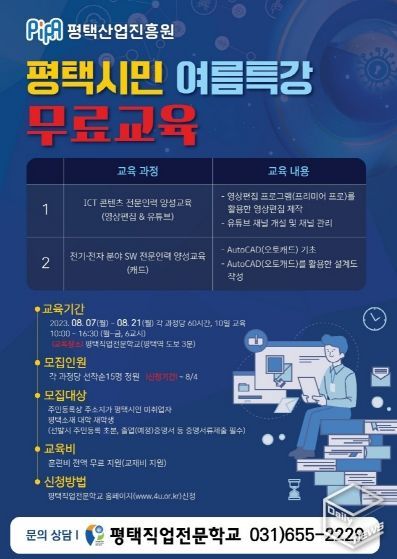각 과정은 오는 8월 4일까지 선착순으로 15인의 교육생을 모집하며, 진흥원 누리집 및 평택직업전문학교 누리집을 통해 교육을 신청할 수 있다.