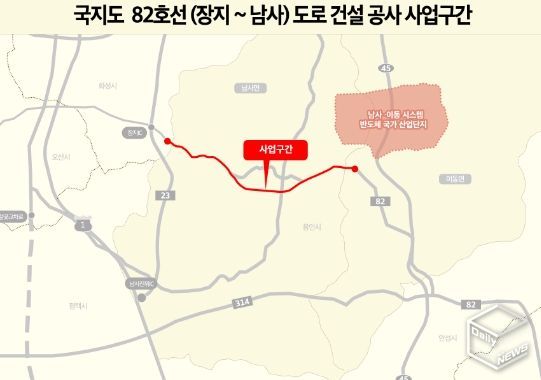 국지도 82호선 개설 사업은 용인특례시 처인구 이동읍 송전리에서 화성시 장지동 장지IC를 잇는 길이 6.8㎞의 도로를 확장·개량하는 것이다.