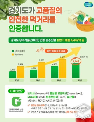 경기도는 올해 상반기 G마크 매출액이 4,449억 원으로 집계됐다고 14일 밝혔다. 경기도 G마크 매출액은 2020년 8,434억 원, 2021년 9,000억 원, 지난해 9,465억 원으로 해마다 증가하는 추세다.