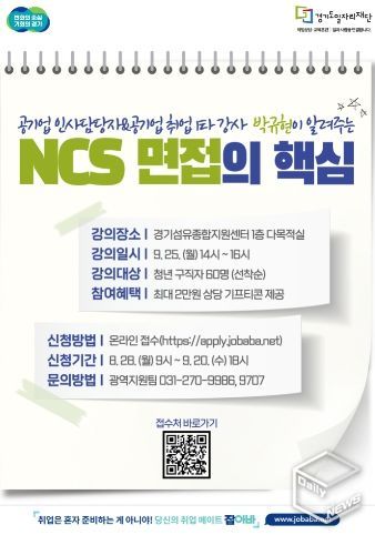 e데일리뉴스 | 경기도일자리재단이 양주일자리센터와 함께 ‘공기업 인사담당자 박규현이 알려주는 국가직무능력표준(NCS) 면접의 핵심’ 특강을 25일 경기섬유종합지원센터에서 연다.