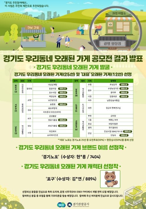 해당 공모전과 함께 치러진 ‘경기도 우리동네 오래된 가게 대표 이름 짓기(브랜드 공모전)’에서는 최종적으로 ‘경기노포’가 선정됐고, ‘경기도 우리동네 오래된 가게 대표 캐릭터’에는 동네 곳곳 숨어있는 노포를 찾아다니는 너구리 캐릭터인 ‘포구’가 선정됐다.