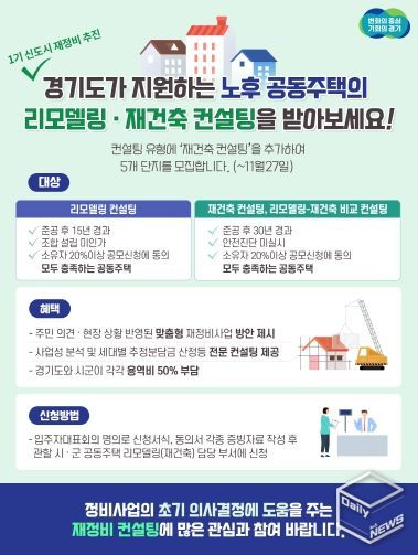e데일리뉴스 | 경기도가 올해 하반기 ‘공동주택 재정비 컨설팅 사업’ 기존 유형인 리모델링, 리모델링-재건축 비교에 재건축을 추가해 5개 단지를 지원한다.