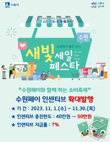 한편, 수원시 전통시장·대형마트·백화점·쇼핑센터·소상공인·협동조합 등이 참여하는 할인행사 ‘제2회 새빛세일페스타, 수원’가 수원시 곳곳에서 11월 11일부터 30일까지 열릴 예정이다.