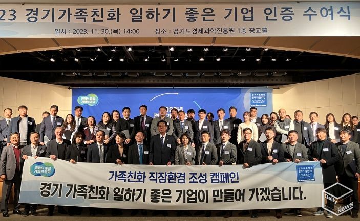 e데일리뉴스 | 경기도는 가족친화경영을 모범적으로 운영한 도내 기업 65개 사를 ‘2023년 경기가족친화 일하기 좋은 기업’으로 인증하고, 30일 경기도경제과학진흥원 광교홀에서 인증서 수여식을 개최했다.