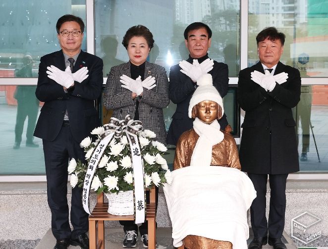염 의장은 이날 오전 도의회 청사 1층 현판 옆에 설치된 평화의 소녀상 앞에서 남경순 부의장(국민의힘, 수원1)과 남종섭 더불어민주당 대표의원(용인3), 염태영 경기도 경제부지사와 함께 추모식을 실시했다.
