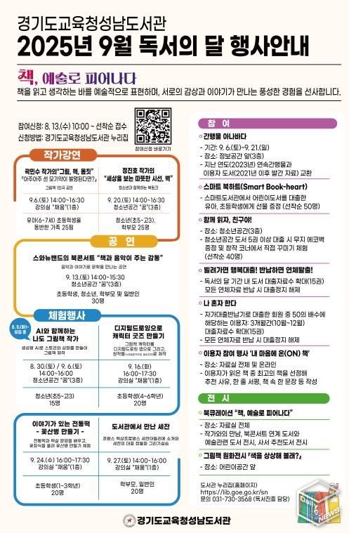 e데일리뉴스 | 경기도교육청성남도서관이 9월 독서의 달을 맞아 ‘책, 예술로 피어나다’를 주제로 한 다양한 독서문화 행사를 운영한다.