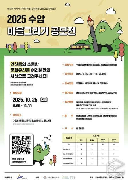 공모전은 관내 유아(5~7세)·초등부(저학년)·초등부(고학년) 등으로 구분돼 열린다. 그리기 공모전 주제는 ▲수암마을전시관 ▲안산읍성 ▲안산동의 문화유산이다.