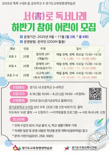 e데일리뉴스 | 경기도교육청평생학습관이 수원교육지원청과 함께 어린이 독서 습관 형성과 사고력 향상을 위하여 초등학교 3~6학년을 대상으로‘서(書)로 독서나래’를 운영한다.