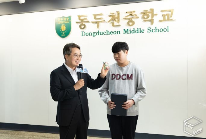 e데일리뉴스 | 김동연 경기도지사가 16일 동두천중학교를 찾아 노점 할머니께 비상금을 건넨 선행으로 화제가 된 옥현일 군에게 표창을 수여했다.