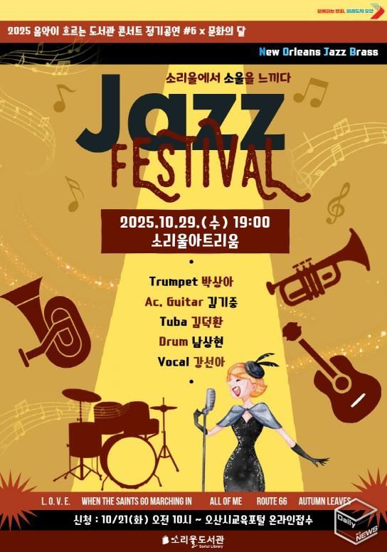 e데일리뉴스 | 경기도 오산시는 오는 10월 29일 오후 7시, 소리울도서관 3층 소리울아트리움에서 '2025 음악이 흐르는 도서관 콘서트 정기공연 #6 × 문화의 달 – Jazz Festival; 소리울에서 소울을 느끼다'를 개최한다고 밝혔다.