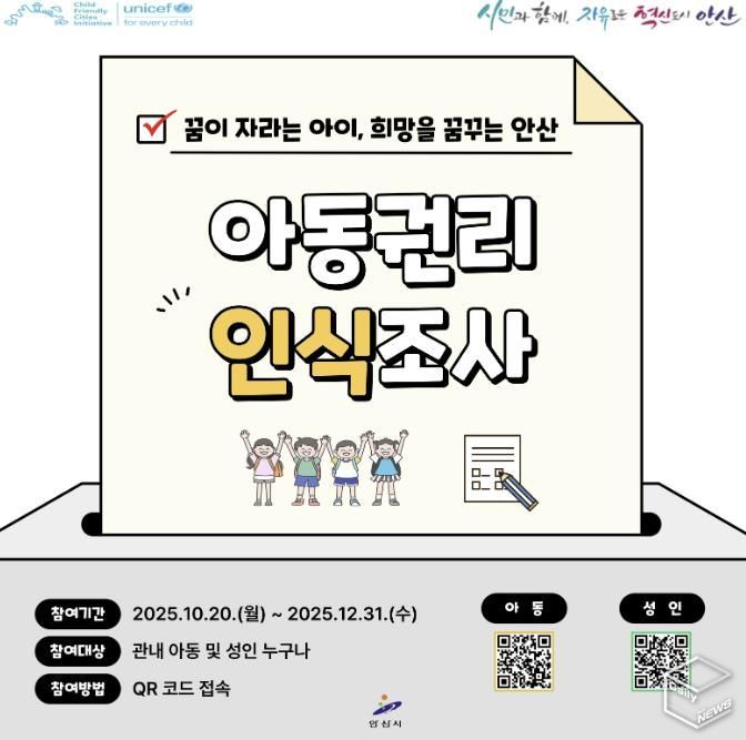 e데일리뉴스 | 안산시는 오는 12월 31일까지 ‘2025년 안산시 아동권리 인식조사’를 실시한다고 20일 밝혔다.