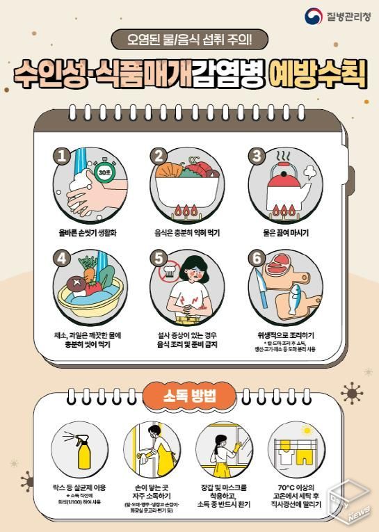 수인성·식품매개감염병은 손 씻기 등 기본적인 개인위생과 올바른 조리·보관 방법만 지켜도 충분히 예방할 수 있다. ▲흐르는 물에 30초 이상 비누로 손 씻기 ▲음식은 충분히 익혀 먹기 ▲물은 끓여 마시기 ▲ 채소나 과일은 깨끗한 물에 충분히 씻기 ▲설사 증상이 있는 경우 음식을 조리하지 않기 ▲음식 종류별로 구분해서 조리 도구 사용하고 소독하기 등 예방수칙을 준수하는 것이 중요하다.