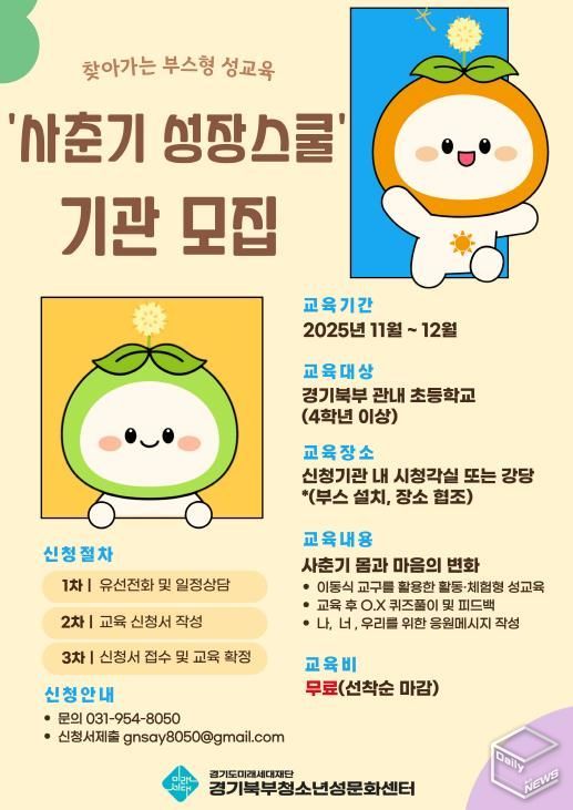 e데일리뉴스 | 경기도미래세대재단에서 운영하는 경기북부청소년성문화센터가 초등학교 고학년 아동·청소년 대상 찾아가는 부스형 성교육 ‘사춘기 성장스쿨’ 프로그램에 참여할 교육기관 9곳을 선착순 모집한다.