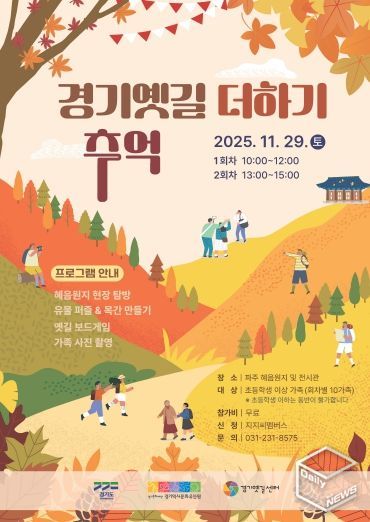 e데일리뉴스 | 경기문화재단 경기역사문화유산원는 오는 11월 29일 토요일, 의주길에 위치한 파주 혜음원지 일대에서 초등학생 이상 자녀를 둔 가족을 대상으로 하는 역사 체험 프로그램 ‘경기옛길 더하기 추억’을 개최한다고 밝혔다.