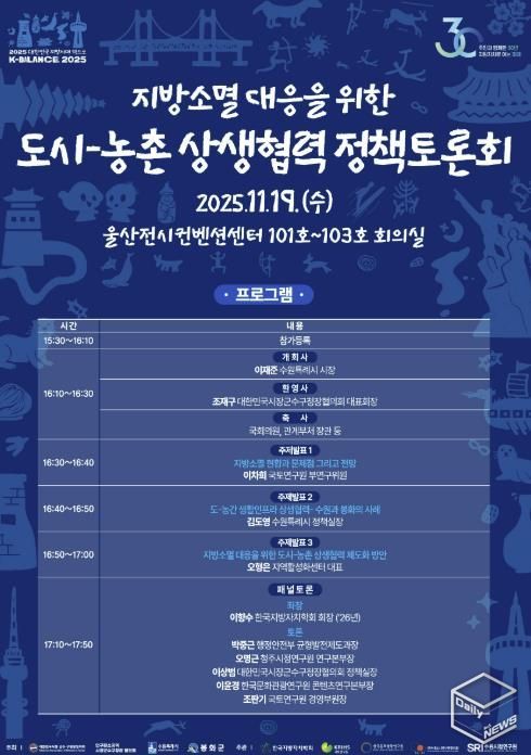 수원특례시(시장 이재준)는 11월 19일 오후 4시 울산전시컨벤션센터 1층에서 ‘지방소멸 대응을 위한 도시–농촌 상생협력 정책토론회’를 개최한다.