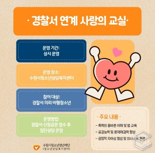 e데일리뉴스 | 수원시청소년청년재단 수원시청소년상담복지센터는 수원영통경찰서와 수원팔달경찰서에서 의뢰된 비행청소년을 대상으로 ‘사랑의 교실’프로그램을 연중 운영하고 있다.