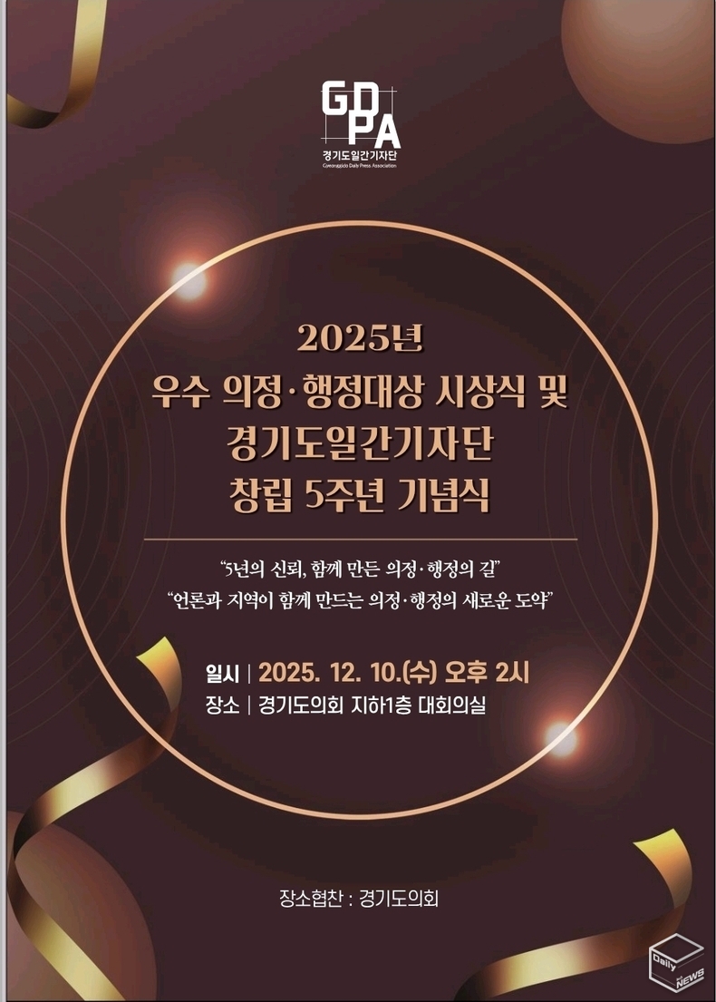 '2025년도 우수의정·행정대상 시상식'은 오는 12월 10일(수) 14시, 경기도의회 대회의실에서 개최될 예정이다.