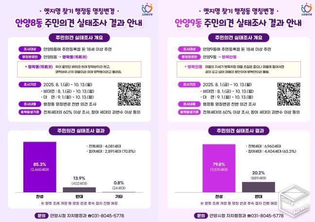앞서 시는 8월 1일부터 10월 13일까지 안양8동과 안양9동에 거주하는 전 세대주민을 대상으로 안양8동을 명학동으로, 안양9동을 병목안동으로 변경하는 것에 대해 찬반조사를 실시했다.