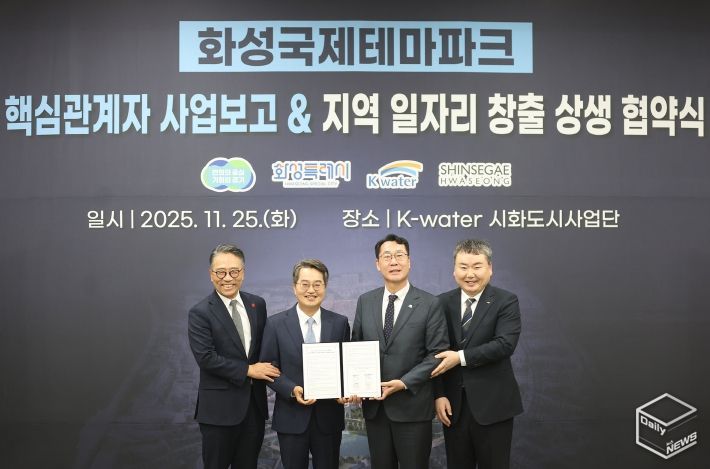 이날 김 지사는 정명근 화성시장, 임영록 신세계그룹 사장, 안정호 K-water 그린인프라부문장과 ‘화성 국제테마파크 지역 일자리 창출 및 상생협력 업무협약’을 체결했다.