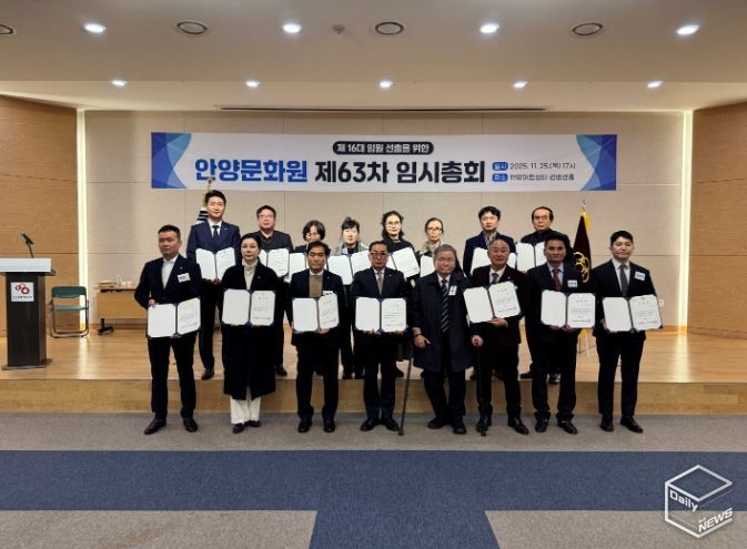 e데일리뉴스 | 안양문화원은 지난 25일 오후 5시 안양아트센터 컨벤션홀에서 제63차 임시총회를 열고 임기 만료(2025.12.26.)에 따른 제16대 원장 및 임원 선출을 진행했다. 이번 임시총회는 정관에 따른 성원이 충족되어 개회됐으며, 원장·부원장·이사·감사에 대한 선출 절차가 공정한 절차에 따라 실시됐다.