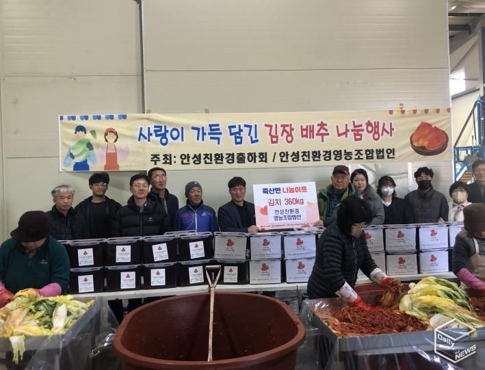 e데일리뉴스 | 안성친환경영농조합법인은 지난 11월 27일과 28일 이틀간 회원 42여 명이 참여해 친환경농산물로 김장김치 360kg을 담가 죽산면 저소득층을 위해 죽산면지역사회보장협의체에 기탁했다.