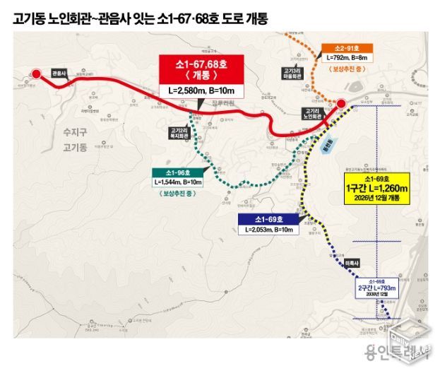 e데일리뉴스 | 용인특례시는 지난 11월 30일 수지구 고기동 노인회관에서 관음사까지 이어지는 도시계획도로 소1-67·68호선(연장 2.58km)을 개통했다고 1일 밝혔다.