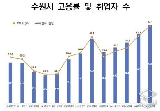 통계청이 발표한 2025년 상반기 수원시 고용률은 64.1%다. 수원시에 살고 있는 15세 이상 시민 100명 중 64명이 수입을 목적으로 일을 하고 있다는 의미다.