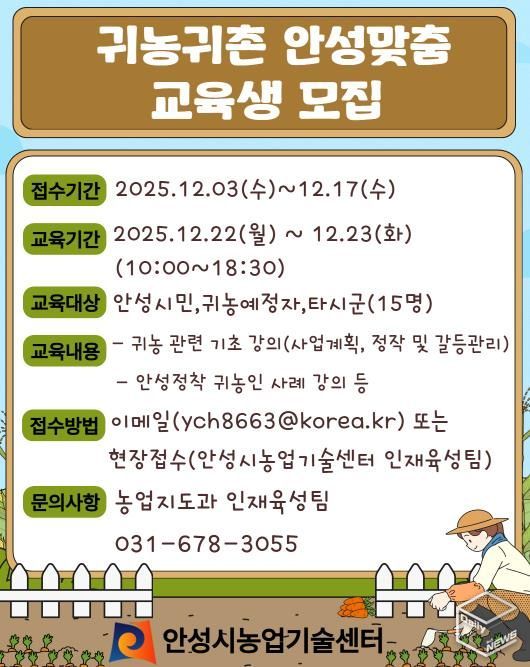 e데일리뉴스 | 안성시농업기술센터는 귀농귀촌인, 귀농귀촌 예정자를 대상으로 귀농귀촌 안성맞춤 교육을 추진한다고 밝혔다.
