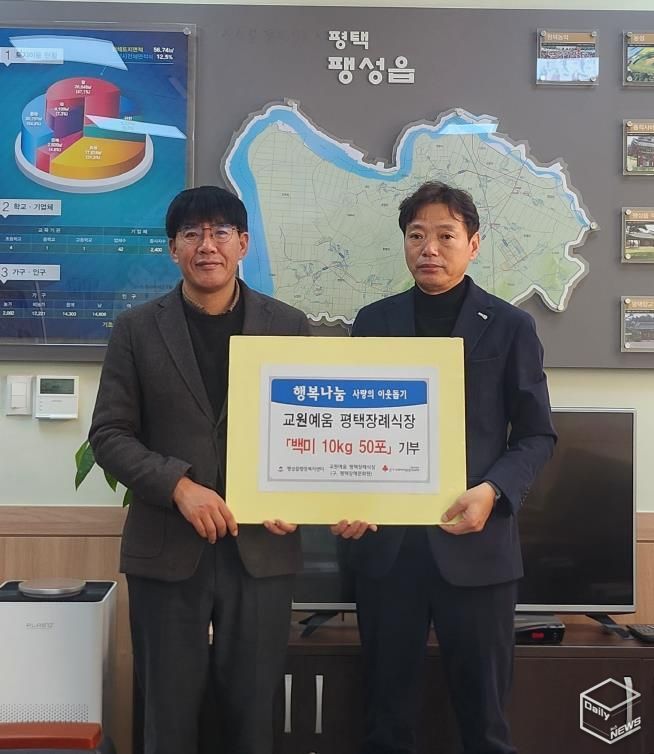 e데일리뉴스 | 평택시에 있는 교원예움 평택장례식장은 지난 18일, 팽성읍 행정복지센터를 방문해 지역의 어려운 이웃에게 전달해 달라며 백미(10㎏) 50포를 기부했다.