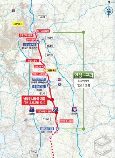 안성~용인~구리 구간(72.2㎞)은 1월 1일 개통됐다. 이 가운데 처인구 모현읍에서 원삼면까지 용인을 남북으로 관통하는 구간의 길이는 26㎞다. 포천~구리 구간(44.6㎞)은 지난 2017년 개통됐고, 안성~세종 구간(59.5㎞)은 2026년 말 개통 예정이다.