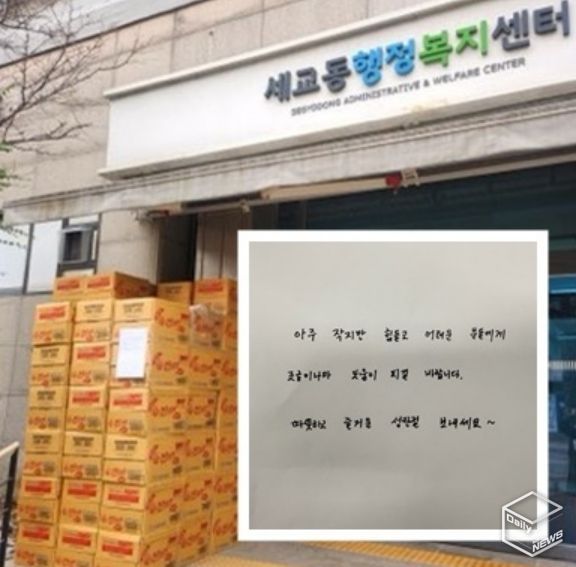 23일 오전, 세교동 행정복지센터 입구에는 이름을 밝히지 않은 기부자가 남기고 간 메모와 라면 100상자가 놓여 있었다.