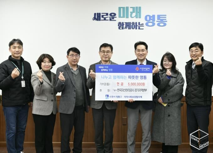 e데일리뉴스 | 수원시 영통구는 지난 24일 한국자산관리공사 경기지역본부에서 관내 경제적으로 어려움을 겪는 이웃을 위해 성금 500만 원을 기부했다고 밝혔다.