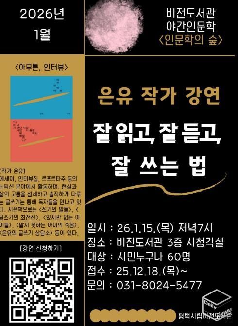 e데일리뉴스 | 평택시 비전도서관은 다음 달 1월 15일 저녁 7시 은유 작가를 초청하여 ‘잘 읽고, 잘 듣고, 잘 쓰는 법’을 주제로 야간 인문학 강연을 진행한다.