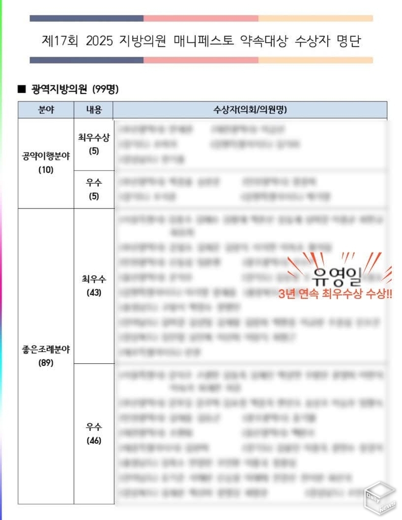 그 결과 유 의원은 한국매니페스토실천본부가 주최한 ‘지방의원 매니페스토 약속대상’에서 좋은조례 분야 3년 연속 최우수상이라는 성과를 거뒀다. 경기도의회 의원 가운데 유일한 기록이다. 단발성 성과가 아니라, 매년 ‘실효성’을 기준으로 다시 평가받아 통과했다는 점에서 이 기록의 무게는 가볍지 않다.