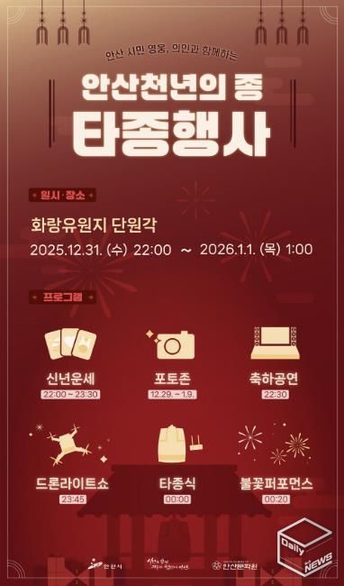 e데일리뉴스 | 안산시는 오는 31일 오후 10시부터 화랑유원지 단원각에서 ‘2026 안산 천년의 종 타종 행사’를 개최한다고 30일 밝혔다.