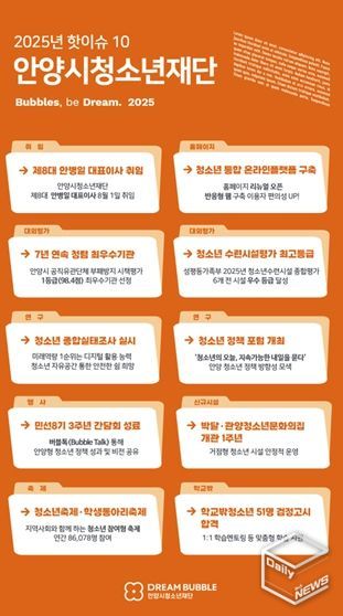 e데일리뉴스 | 안양시청소년재단은 올 한 해를 돌아보는 ‘2025년 안양시 청소년재단 핫이슈 10’을 선정하고, 2025년 청소년 정책 컨트롤타워로서의 기능을 강화해 청소년 체감형 정책 성과를 거뒀다고 30일 밝혔다.