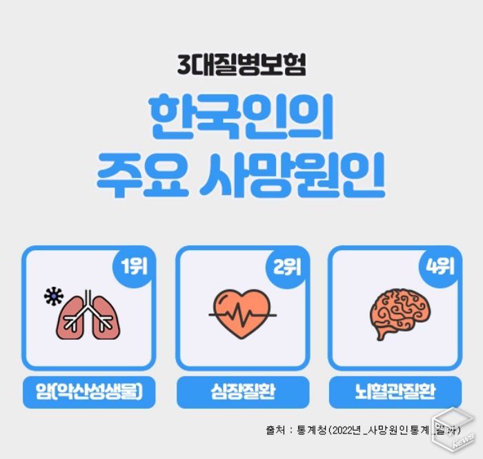 e데일리뉴스 | 3대질병으로 일컬어지는 암, 뇌혈관질환, 심혈관질환은 한국인의 주요 사망원인에서 상위를 차지하고 있으며, 이에 대한 진단비를 집중적으로 보장해 주는 보험상품을 3대질병진단비 보험이라 할 수 있다.