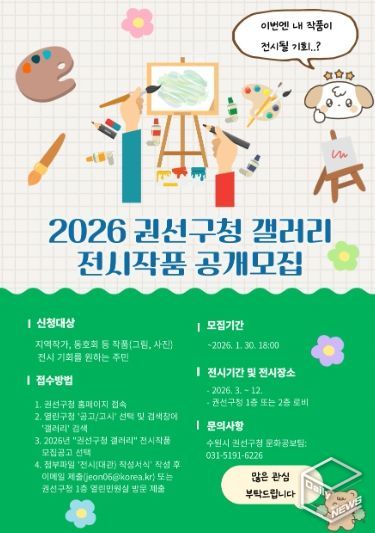 e데일리뉴스 | 수원시 권선구는 1월 30일까지 2026년 권선구청 갤러리 전시작품을 공개모집한다.