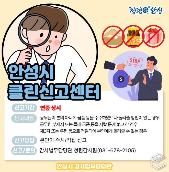 e데일리뉴스 | 안성시는 시민들에게 신뢰받는 공정하고 투명한 행정 서비스를 제공하기 위해 ‘클린신고센터’를 연중 상시운영하며 청렴한 행정문화 정착에 힘쓰고 있다고 밝혔다.