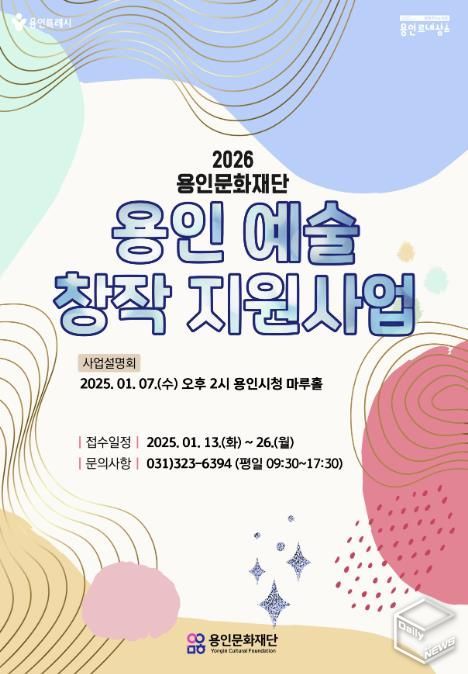 e데일리뉴스 | 용인문화재단은 기존'문화 예술 공모 지원사업'을 전면 개편하고, 사업명을 ‘2026 용인 예술 창작 지원’으로 변경해 새롭게 전환한다고 밝혔다. 이번 사업은 지난 6일 공고됐으며, 1월 13일부터 26일까지 접수를 통해 총 6억 400만 원의 지원금을 사업 유형과 규모에 따라 차등 지원할 예정이다.