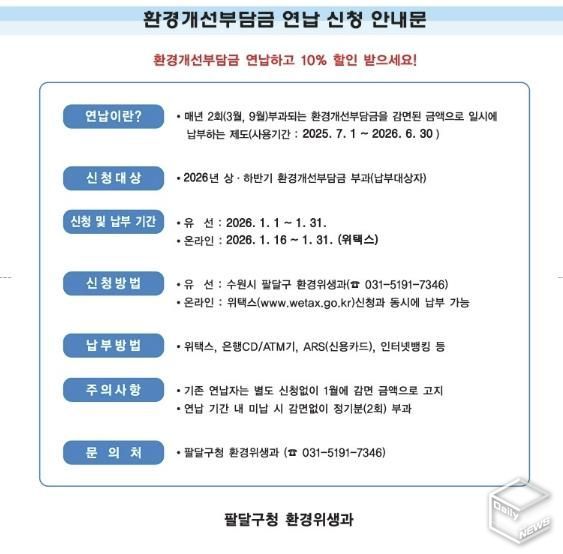 e데일리뉴스 | 수원시 팔달구는 환경개선부담금 납부 대상자를 대상으로 1월 31일까지 환경개선부담금 연납 신청을 받는다.