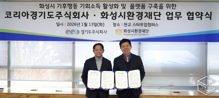 e데일리뉴스 | 경기도주식회사는 13일 경기도 성남시 판교 스타트업캠퍼스에서 화성시환경재단과 ‘기후행동 기회소득 활성화 및 화성시 플랫폼 구축을 위한 업무협약’을 체결했다.