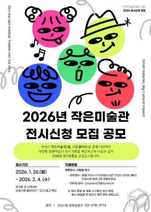 e데일리뉴스 | 안성시는 이달 26일부터 2월 4일까지 ‘안성시 작은미술관(결·시옷갤러리) 전시 신청 모집 공모’을 개최한다고 밝혔다.