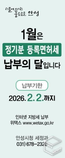 안성시 관계자는 “등록면허세 납부기한은 2월 2일까지로, 납기 마지막 날에는 민원인이 몰려 혼잡하거나 온라인 접속이 지연될 수 있으므로 조기 납부를 부탁드린다”고 당부했다.