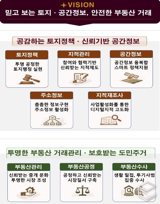 추진계획은 ▲투명하고 균형 잡힌 제도 운영으로 신뢰받는 토지행정 실현 ▲참여와 협력을 통한 신뢰받는 지적제도 정착 ▲공간정보 융·복합을 통한 스마트한 정책 지원 ▲촘촘한 주소정보 구현 및 주소정보 활성화 추진 ▲사업활성화를 통한 디지털지적 고도화 ▲신뢰받는 중개 문화와 투명한 부동산 시장 조성 ▲공정하고 신뢰받는 시장질서 구축 ▲생활밀접, 투기사범 집중수사 등 8대 전략을 바탕으로 한 92개 세부 이행과제로 구성됐다.